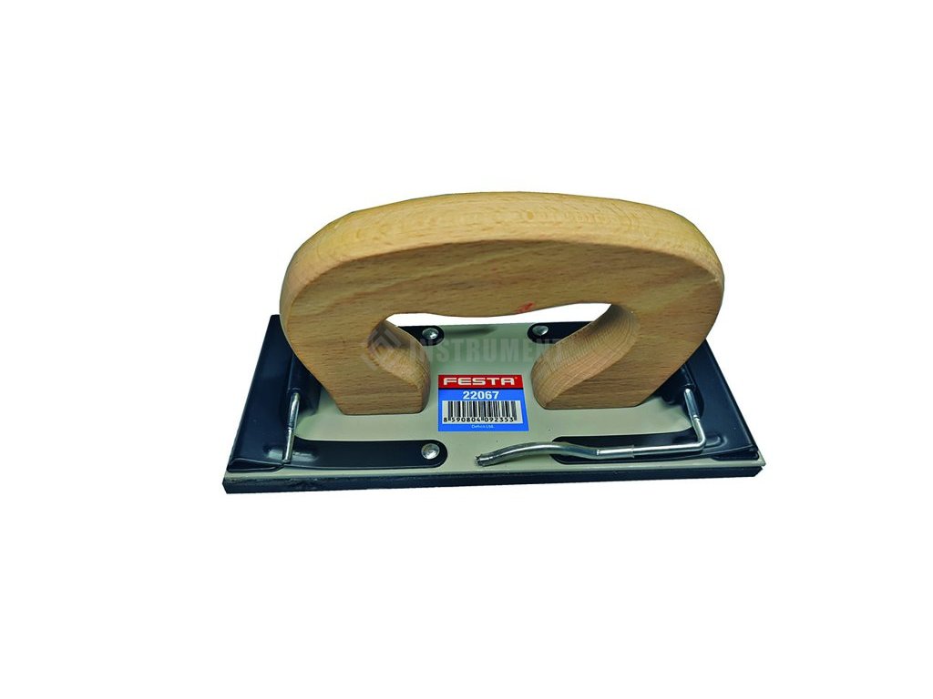 Profesionální ruční držák na brusné materiály - plátna, papíry, mřížky. Rukojeť vyrobená z kvalitního bukového dřeva, opracování i tvar ručky je přizpůsoben optimálnímu sklonu ruky při broušení, aby docházelo k rovnoměrnému tlaku na celou brusnou plochu při minimální námaze, rychlá a snadná výměna brusného materiálu, silné uchycení. Guma na pracovní ploše umožňuje dobré přizpůsobení a kopírování broušené plochy. Rozměry 17 * 7 cm.