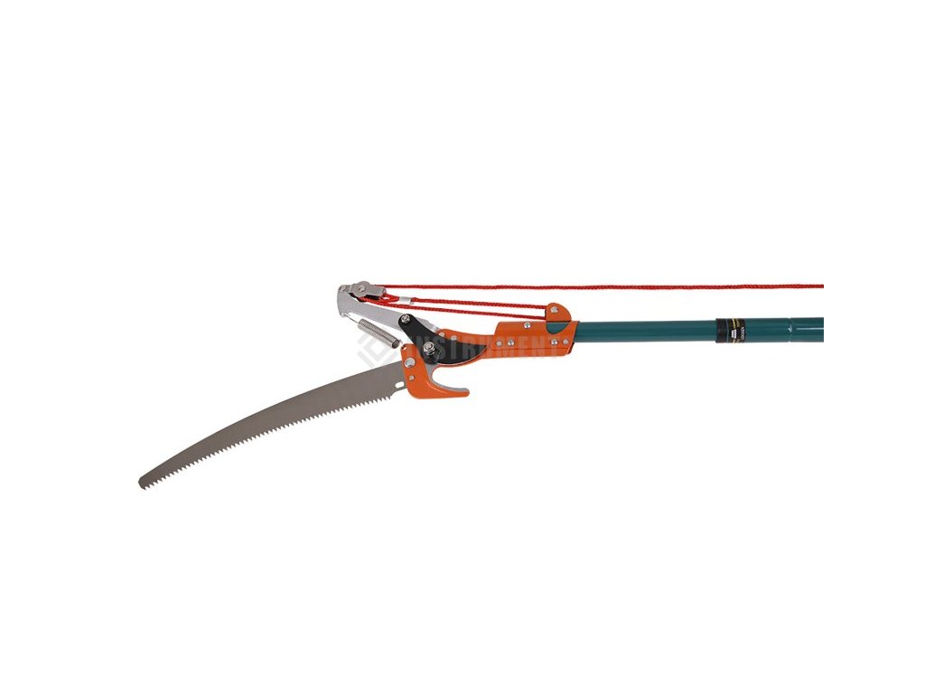Housenice, teleskopická násada délka max 240 cm, oblý břit s nepřilnavou povrchovou úpravou + pilka 30 cm, použití : ke stříhání a prořezávání větví v koruně stromů, převodové ovládaní břitu usnadňuje namáhání při střihu
