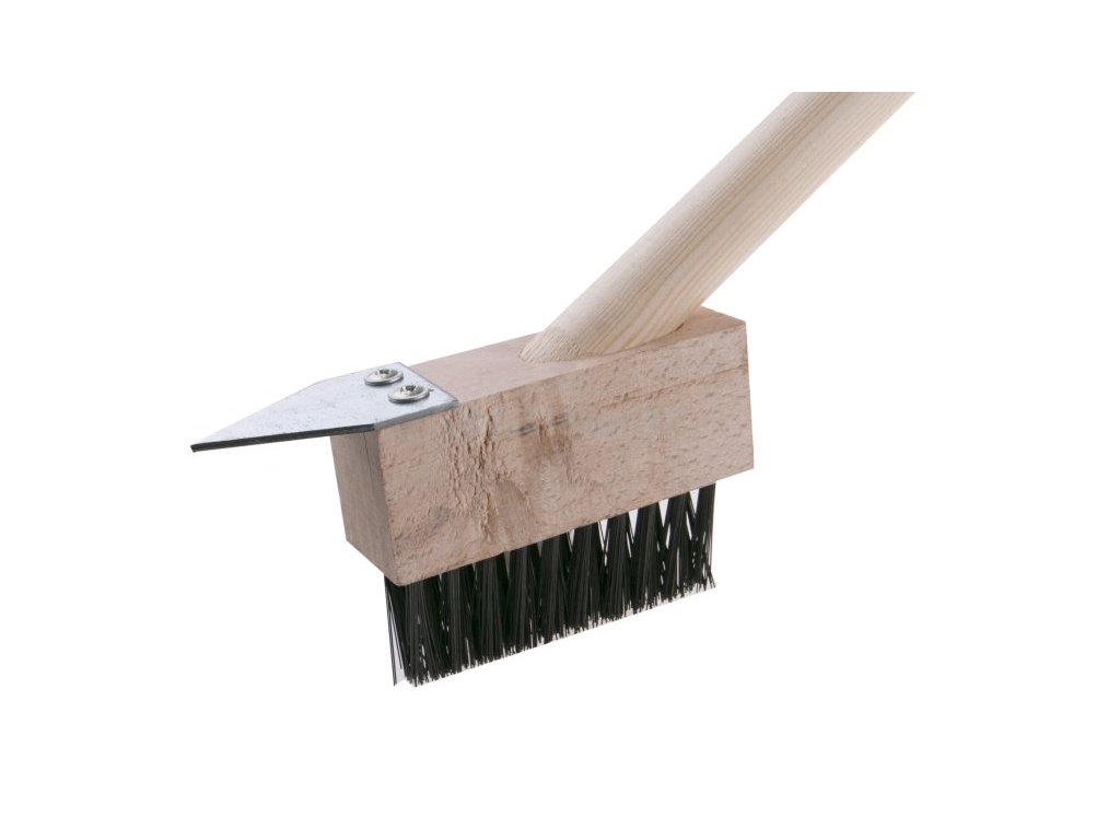 Kartáč na čištění zámkové dlažby s rukojetí. Kartáč na zámkovou dlažbu je velmi účinný při odstraňování mechu a plevele na menších plochách. Kartáč ze smrkového dřeva je osazený kvalitním ocelovým drátem. Délka násady 140 cm.