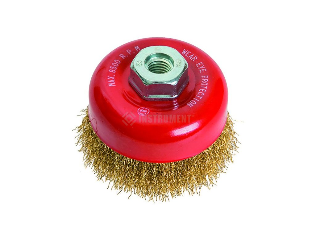 Kartáč miskový s mosaznými vlnitými drátky, uchycení M14, hrnkový, vhodné pro nerezové materiály.