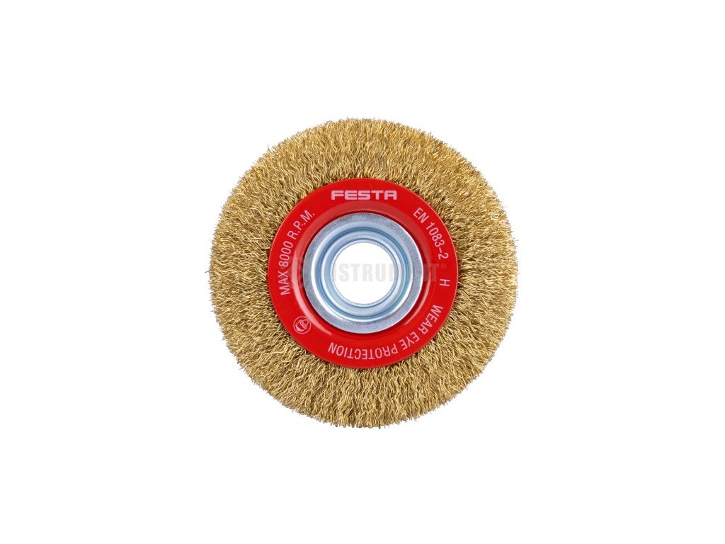 Rotační kartáč - okružní, provedení : vlnitý drát, kartáče FESTA zaručují kvalitní použité materiály i zpracování, drát 0,3mm - pomosazený, průměr 100mm, uchycení otvor 20mm (včetně redukčních kroužků 12,5 a 16 mm), počet drátů 3000, délka drátů 22 mm, maximální otáčky za min