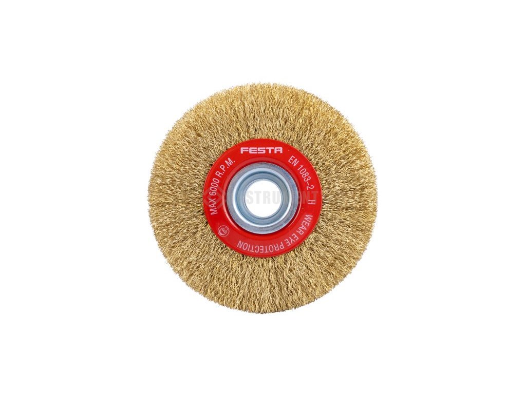 Rotační kartáč - okružní, provedení : vlnitý drát, drát 0,3mm, kartáče FESTA zaručují kvalitní použité materiály i zpracování, průměr 125 mm, uchycení otvor 20 mm (včetně redukčních kroužků 12,5 a 16 mm), počet drátů 4950, délka drátů 22 mm, maximální otáčky za min. 6000, vhodný pro zámečnické a kovoobráběcí práce, odstraňování rzi, barev, leštění.… , balení : papírový box.