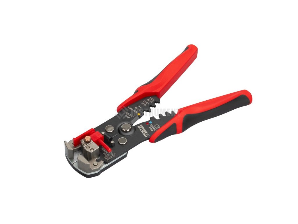 multifunkční profesionální kleště s automatickými odizolovávacími čelistmi, v rukojeti integrované lisovací/krimpovací čelisti na běžné koncovky (konektory), stříhací čelisti