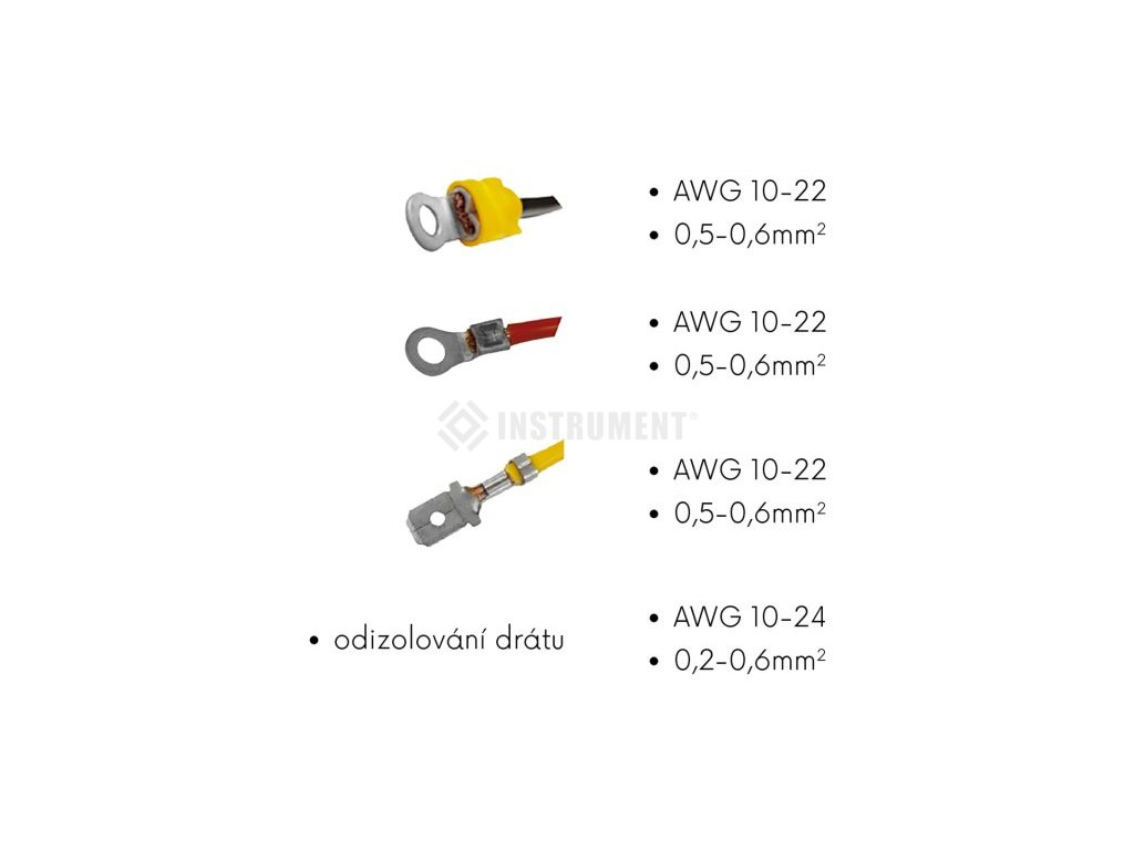 převodový mechanismus, nastavitelná délka odizolovávané části řidiče - rychlý způsob odizolovávání, na jeden stisk - čelisti se samy přizpůsobí průměru drátu nebo řidiče