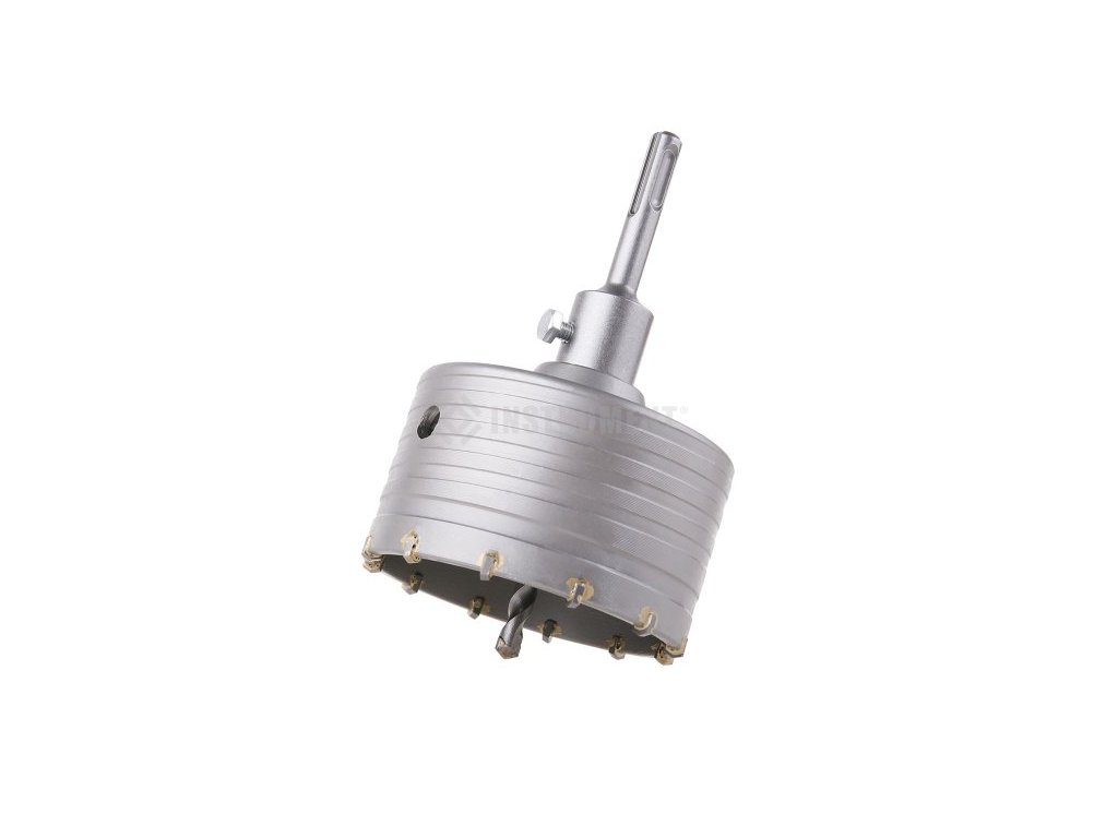vykružovací / vrtací korunka s SK plátky a vodícím vrtákem uchycení SDS+ kvalitní SK plátky (SK - slinutý karbid), dlouhá životnost, rychlý prostup materiálem vodící - středící vrták usnadňuje práci a korunku přesně vede a drží na požadovaném místě pro vrtání větších průměrů do betonu, porobetonu, cihel a podobných zdících materiálů korunka není vhodná na vrtání železobetonu