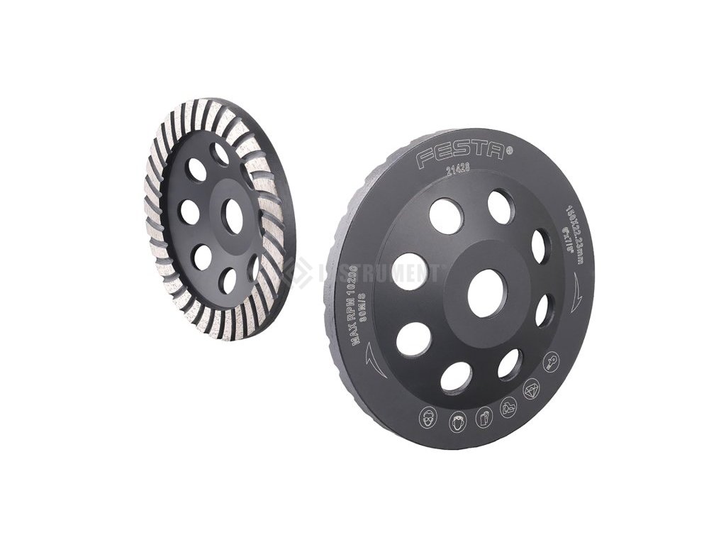 Brusný diamantový kotouč FESTA turbo, robustní nosný talíř je z pevné slitiny, speciální konstrukce uchycení diamantových segmentů k nosnému disku kotouče, vysoký obsah diamantového prachu v segmentech, použití : pro suché broušení mramoru, žuly, cihel, zdiva, přírodního i umělého kamene, obkladů, dlažeb