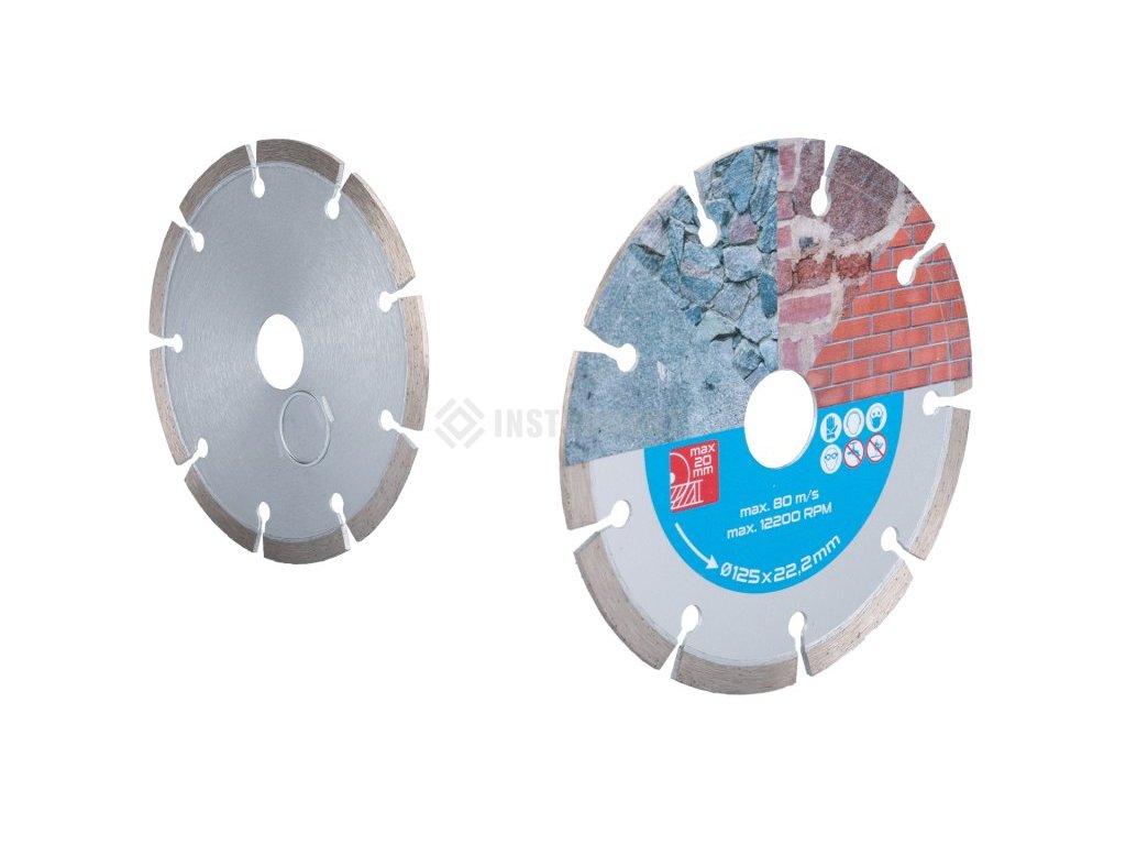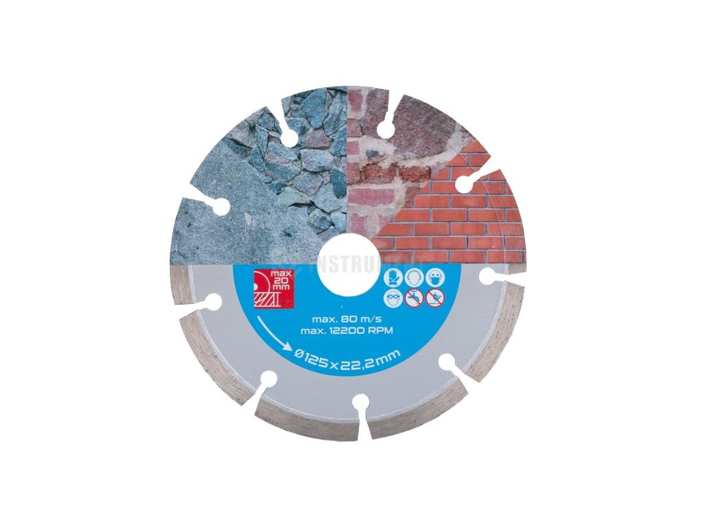 Diamantový kotouč DIAMANT, provedení : SEGMENTOVÝ, kvalitní materiály i zpracování - vysoce pevné uchycení diamantových segmentů k nosnému disku kotouče, vysoký obsah diamantového prachu v segmentech, použití : pro suché řezání betonu, cihel, zdiva, kamene, ... , balení : blistr s eurootvorem, přiložen redukční kroužek z 22,2 na 20 mm, rozměry : uvedeny v názvu výrobku.