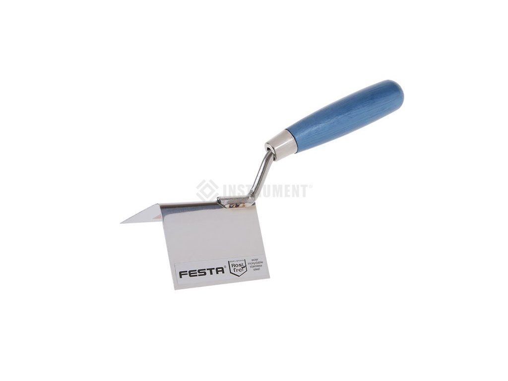 Rohová vyhlazovací nerezová lžíce FESTA 80 x 60 x 60 mm s dřevěnou ručkou. Lžíce rohová (koutová) je vyrobená z kvalitní nerez oceli o tloušťce 1,0mm, držadlo je dřevěné s lakovanou povrchovou úpravou. Vymazávačka se používá k úpravě a začištění jak vnějších, tak vnitřních rohů.