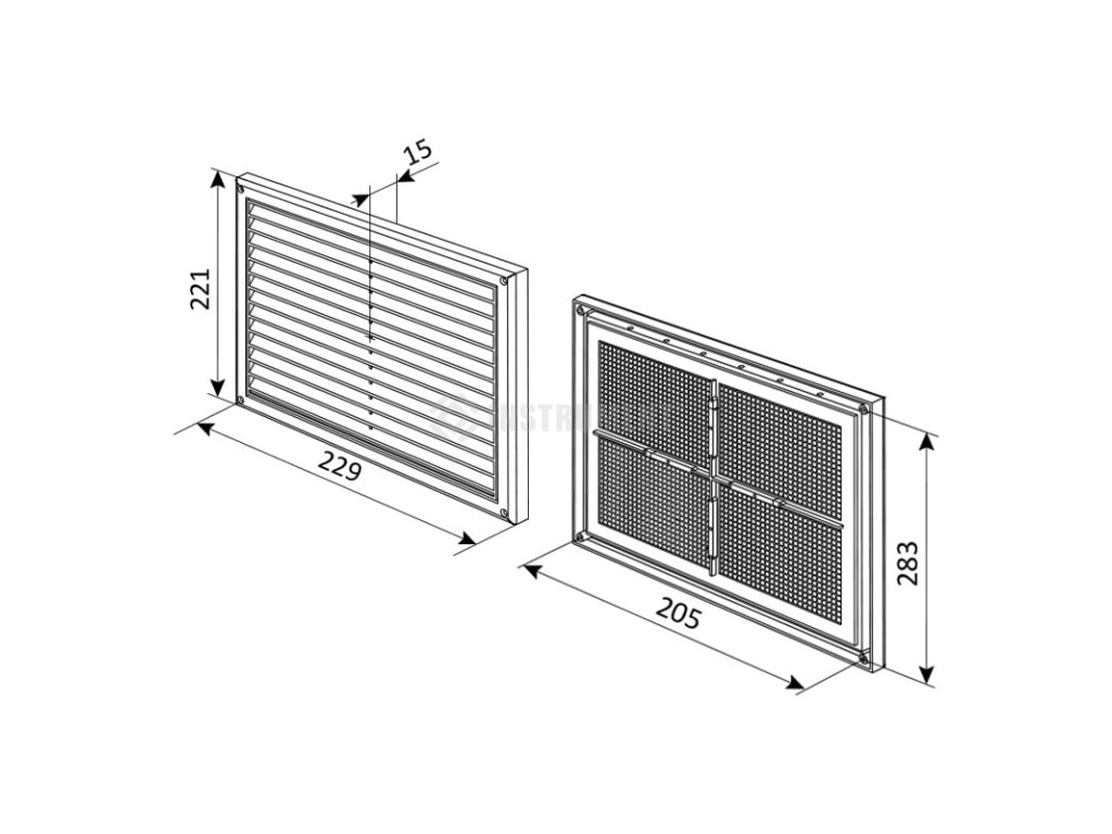 Čtyřhranná plastová mřížka bílá bez nástavce, 299 x 221 mm.