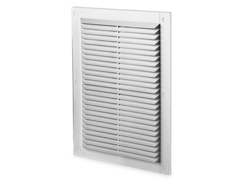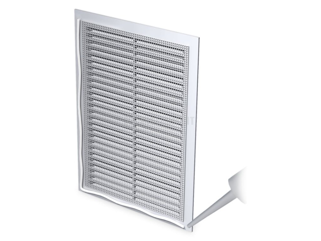 Čtyřhranná nalepovací plastová bílá mřížka bez nástavce, 170 x 238 mm.