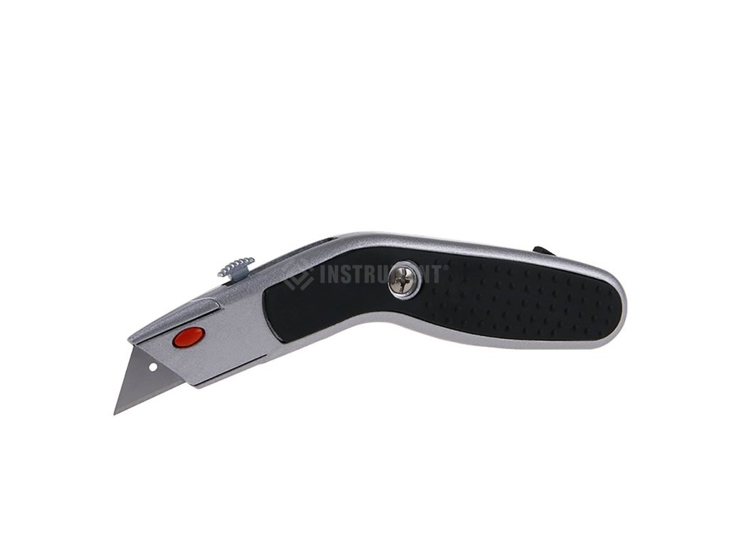 Kovový nůž s výsuvnou lichoběžníkovou čepelí, čepel uchycena uvnitř těla nože na posuvném jezdci, ergonomický tvar s pogumovanou rukojetí, výklopný zásovník na náhradní čepele.