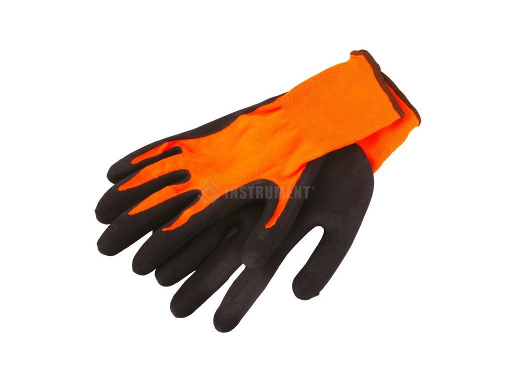 Oranžový úplet z jemného nylonovu, dlaň máčena v černé latexové pěně, CE EN 388, velikost 9