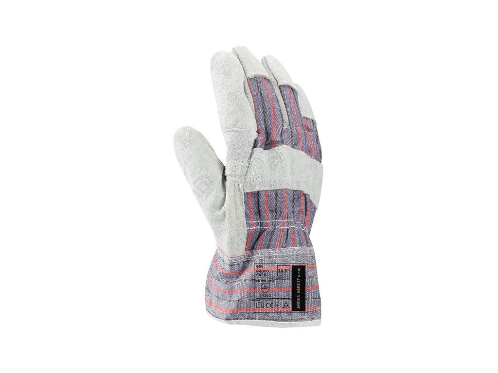 Dlaň z hovězí štípenky, hřbet a manžeta z bavlněné tkaniny, CE EN 388, velikost 10,5.