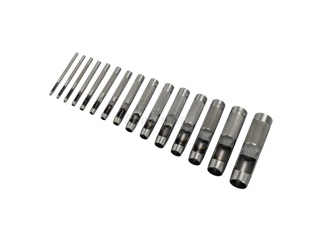 Ocelové děrovače na kůži. Děrovače jsou opatřeny bočním výhozem odpadu. Sada 15ks. Průměry děrovačů: 2mm, 2,5mm, 3,2mm, 4mm, 4,8mm, 5mm, 6,4mm, 8mm, 9,5mm, 11,1mm, 12,7mm, 14mm, 15,8mm, 19mm, 22mm.