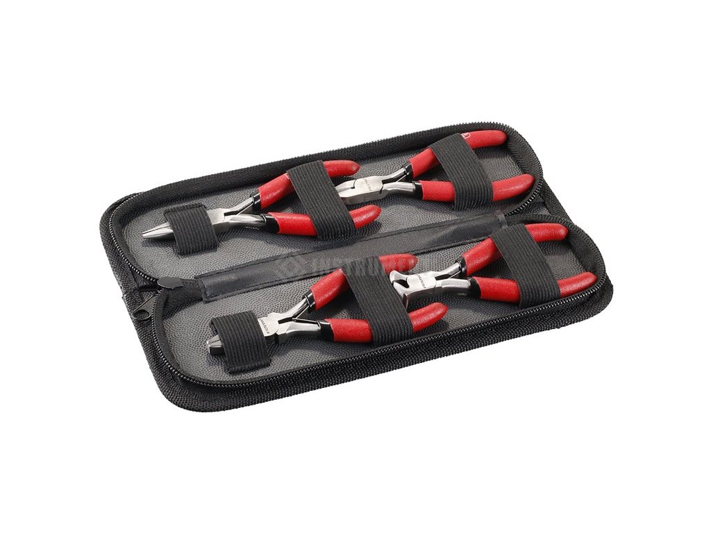 Sada minikleští (110mm) v praktickém uzaviratelném pouzdře, obsah sady: kombinované, radiové, boční a čelní štípací kleště, pogumované rukojeti, pro jemnou dílenskou práci