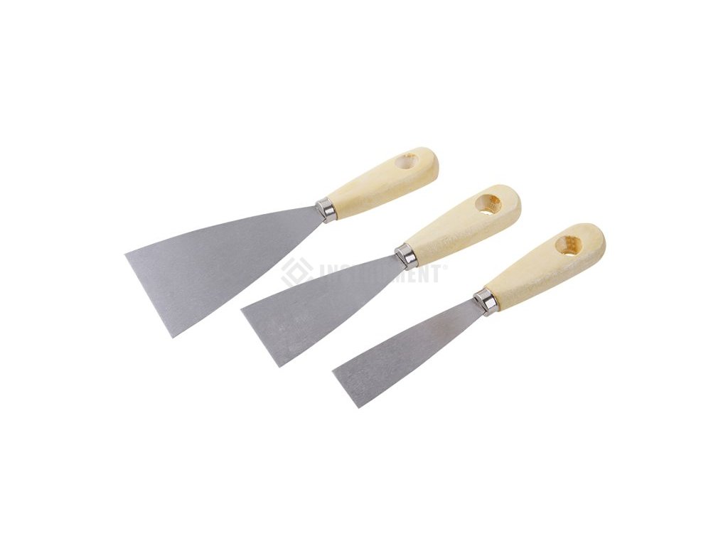 Sada ocelových špachtlí 30, 50, 80 mm s dřevěnými ručkami. 3 ks/balení. Špachtle se používá k nanášení a roztírání stavební sádry, tmelů nebo k očištění a odstranění starých tmelů, maleb či tapet. Díky trojúhelníkovému tvaru se materiál velmi snadno nanáší i odstraňuje.