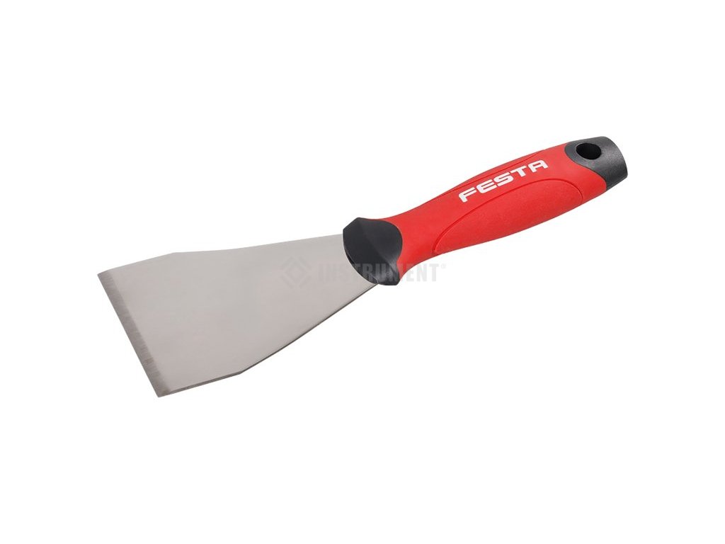 škrabací nerezová špachtle FESTA 75 mm zesílená čepel - tloušťka 2 mm s broušenou hranou speciální vyhnutí čepele usnadňuje práci ergonomická rukojeť z měkčené TPE gumy