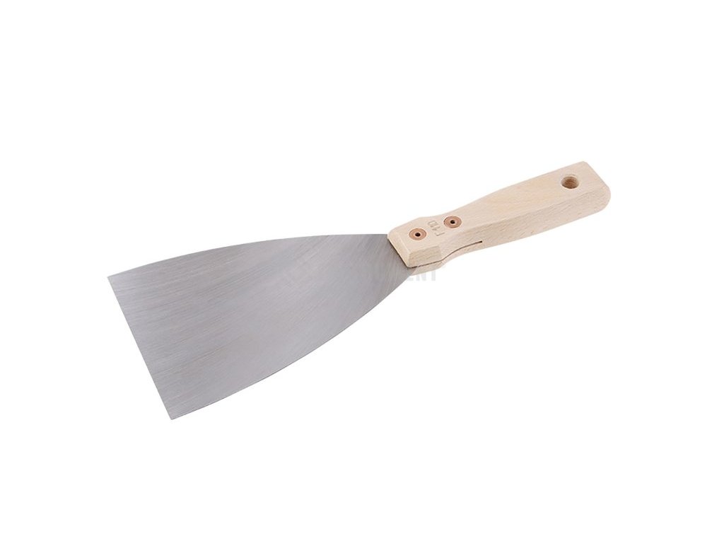Malířská stěrka (špachtle) s broušeným ocelovým břitem a s dřevěnou nýtovanou rukojetí. Malířské stěrky se použivají pro zapravování děr, zeškrabavání přebytečného materiálu apod. Šířka břitu: 110mm