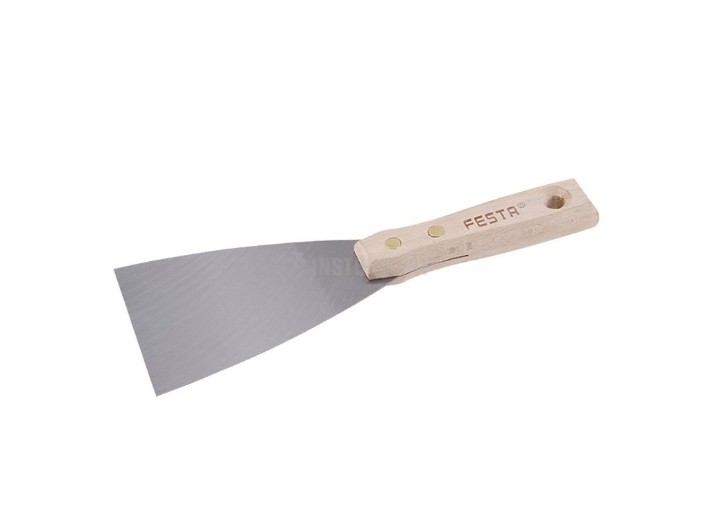 Malířská stěrka (špachtle) s broušeným ocelovým břitem a s dřevěnou nýtovanou rukojetí. Malířské stěrky se použivají pro zapravování děr, zeškrabavání přebytečného materiálu apod. Šířka břitu: 90mm