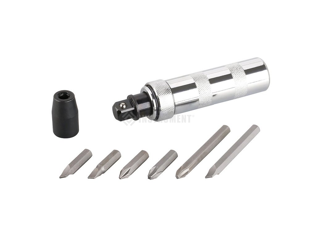 úderový šroubovák - sada s bity odnímatelná upínací hlava na bity - na čtyřhranu 1/2" - lze použít i na povolování šroubů a matic masivní tělo uzpůsobené mechanickému namáhání, princip - vnitřní mechanismus těla šroubováku zajistí po úderu pootočení hlavy a tím trhnutí a uvolnění hlavy vrutu popř