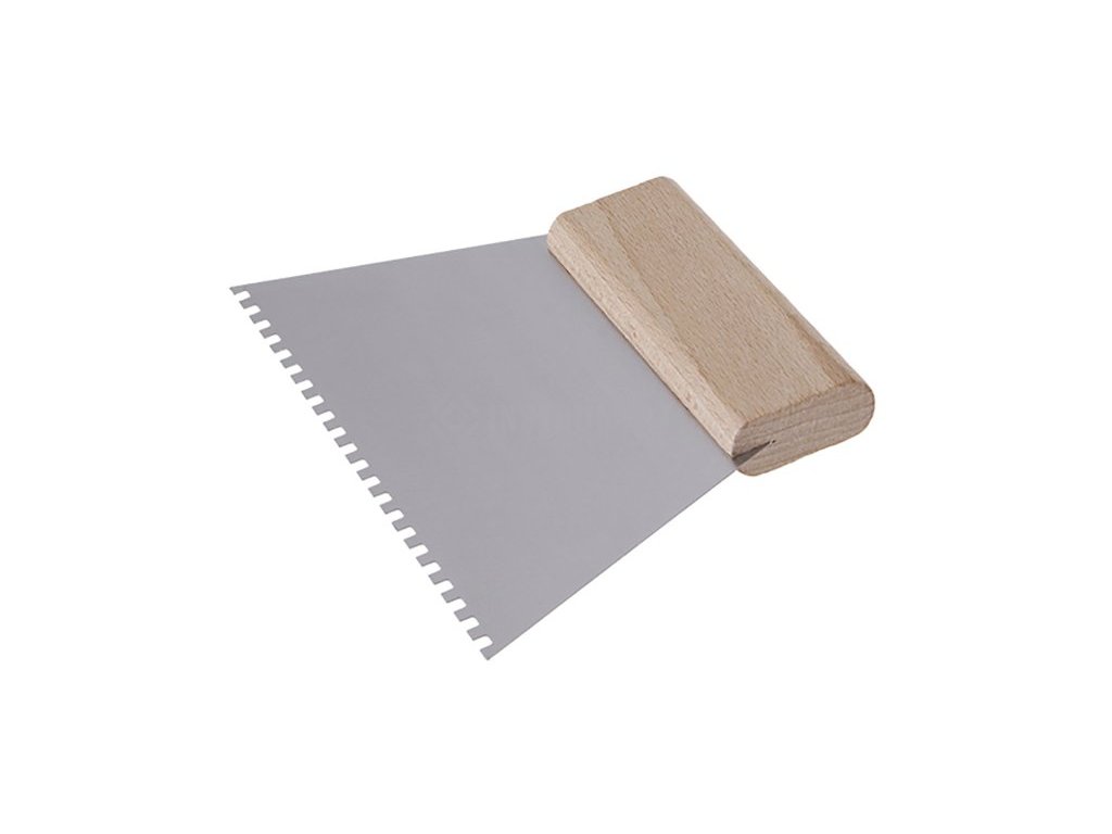 Stěrka ocelová 180 mm zub e4 s dřevenou rukojetí. Stěrka pro malířské, zednické a podlahářské práce. Slouží k aplikaci samonivelačních hmot, lepidel, malty atd.