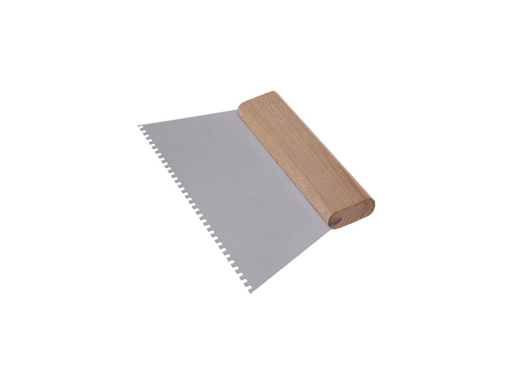 Stěrka ocelová 250 mm zub e4 s dřevenou rukojetí. Stěrka pro malířské, zednické a podlahářské práce. Slouží k aplikaci samonivelačních hmot, lepidel, malty atd.