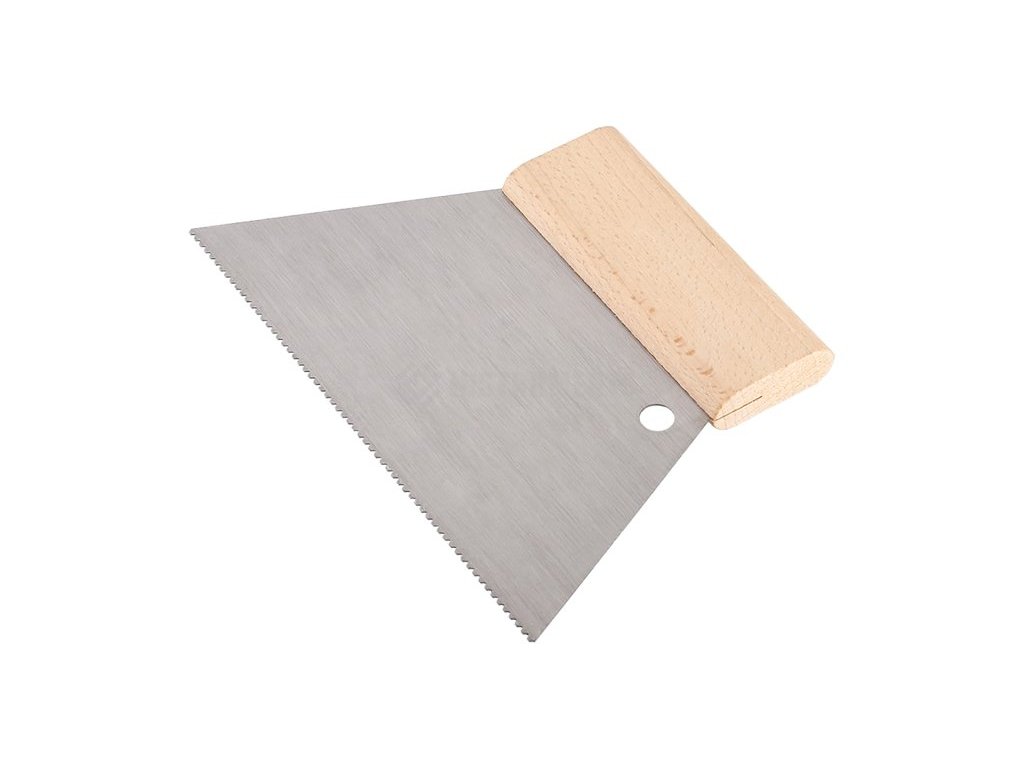ocelová stěrka s dřevěnou rukojetí pro podlahová lepidla trojúhelníkový zub 1