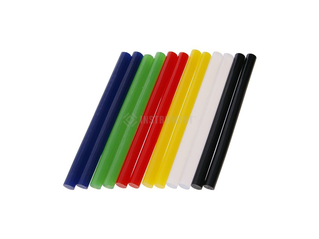Barevné tavné tyčinky pro rychlé a jednoduché montáže, lepení za tepla a opravy různých materiálů (PVC, plastů, dřeva, korku, kovů, skla, textilií apod.). Tavné lepidlo je vhodné i pro domácnosti - lepení papíru, lepenky, keramiky, umělých květin a těsnění drobných trhlin. Tavné tyčinky vykazují vysokou lepivost k různým druhům materiálů a to i v kombinaci savý – nesavý povrch. Lepený spoj je odolný vlhku i vodě. Použití pro interiér i exteriér. Aplikace tavných tyčinek: Tavné lepidlo nanášíme na předem připravený podklad (na jednu stranu lepených ploch) a to přesně dle šířky stykových ploch. Ihned po nanesení přitisknemelepené materiály k sobě a zajistíme proti pohybu na dobu cca 10-15 minut.