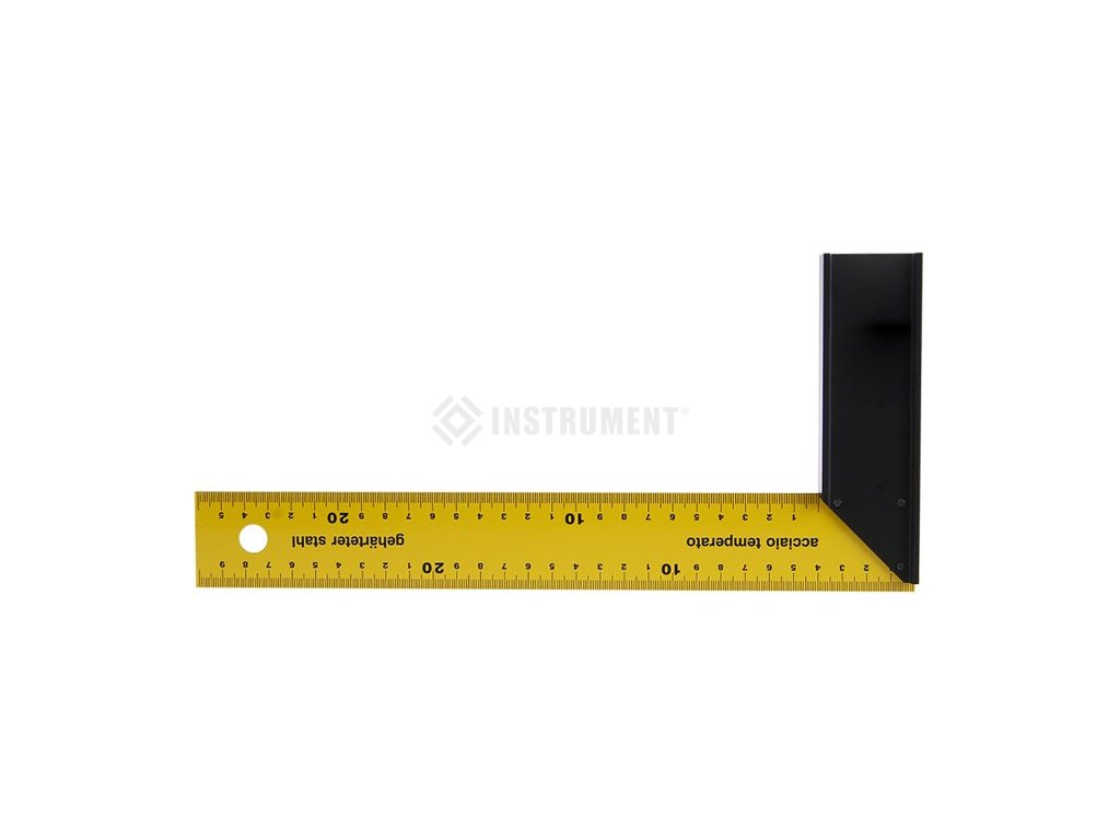 Truhlářský úhelník, kvalitní zpracování a materiály ( tvrzená pružinová ocel, opěrné rameno z černě eloxovaného hliníku), stupnice v mm, přesnost 0,5mm/m