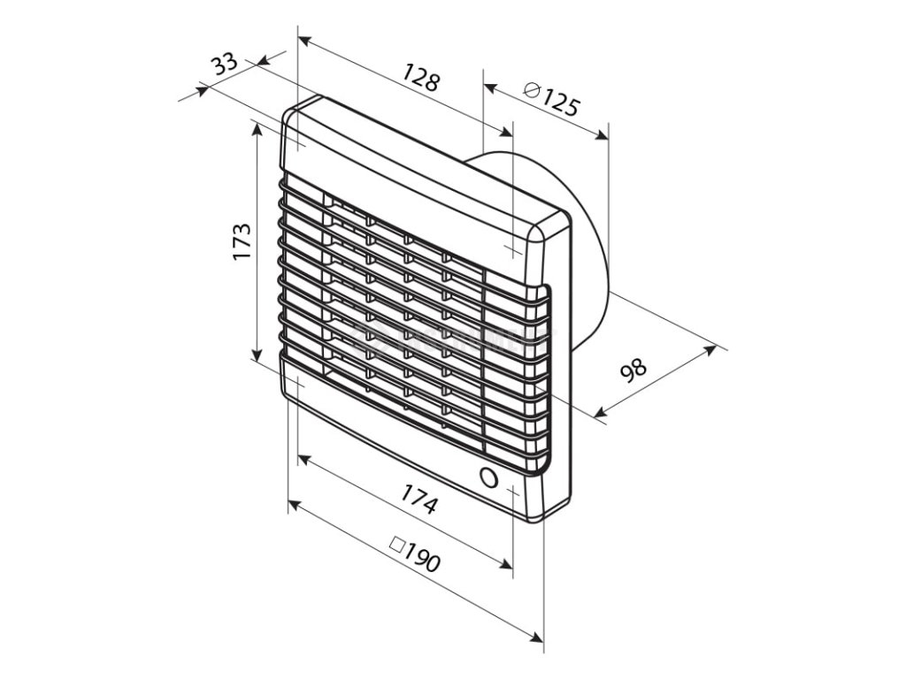 Domovní axiální ventilátor Ø 125 mm, automatická žaluzie, tahový vypínač, časový vypínač.