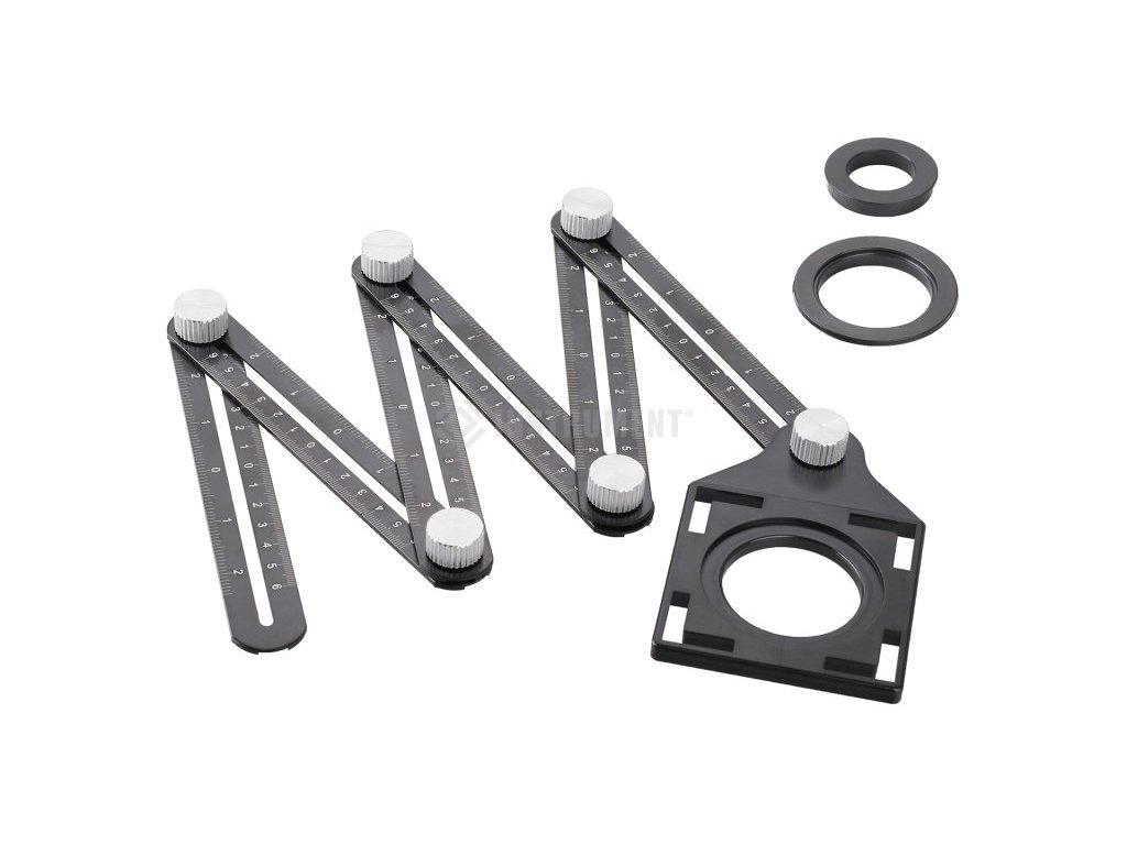 víceučelové skládací pravítko - šablona pro značení, přenos a vytváření speciálních tvarů, úhlů nebo otvorů pro obkladače, podlaháře a jiné profese nejen ve stavebnictví 6 kovových nastavitelných ramen s centimetrovou a palcovou stupnicí masivní aretační šrouby pro přesné a jednoduché nastavení požadovaného tvaru průměry pro značrní otvorů 26, 41 a 46 mm