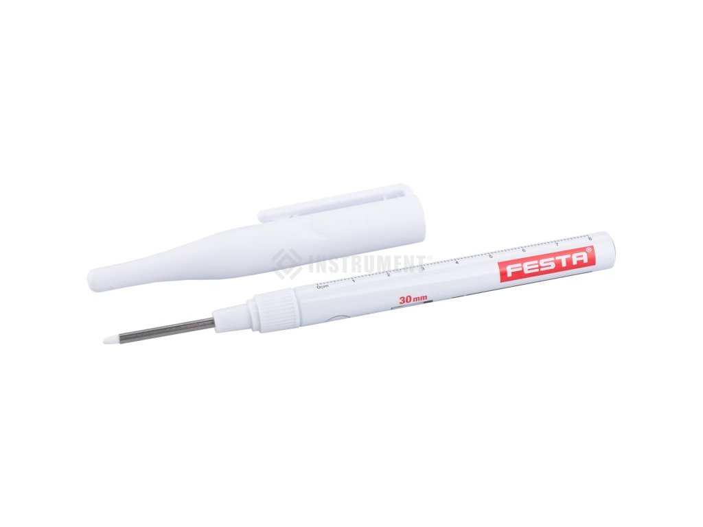 permanentní hloubkový značkovač - bílý průměru hrotu jen 3 mm, umožňuje značení malých průměrů skrz až 30 mm silných materiálech použitelný na většinu povrchů